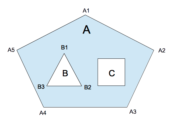 In the WKT representation, the outer ring must be listed first, with the vertices listed in counter-clockwise order (e.g. A5, A4, A3, A2, A1). The inner rings, if any, are listed next with the vertices in clockwise order (e.g. B1, B2, B3). The lines of the rings must not cross or overlap and the description of each ring must list the starting vertex twice: as both the first and last vertex.