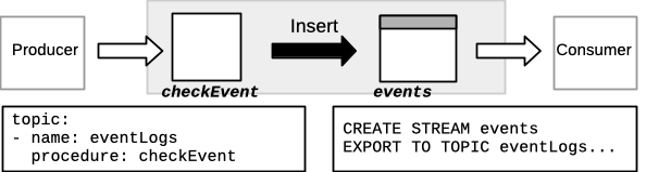 CREATE STREAM eventlog PARTITION ON COLUMN e_type EXPORT TO TOPIC eventlogs ( e_type INTEGER NOT NULL, e_time TIMESTAMP NOT NULL, e_msg VARCHAR(256) ); CREATE PROCEDURE PARTITION ON TABLE eventlog COLUMN e_type FROM CLASS mycompany.myprocs.checkEvent;